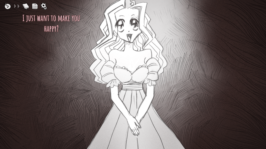In another, the princess, or your understanding of her, breaks apart. Assuming youd been trying to save her from the start, she loves you but can also fall into a sort of infatatuation, and once you start to question her on what shed like to do, her sense of self slips. She repeats the same line over and over,