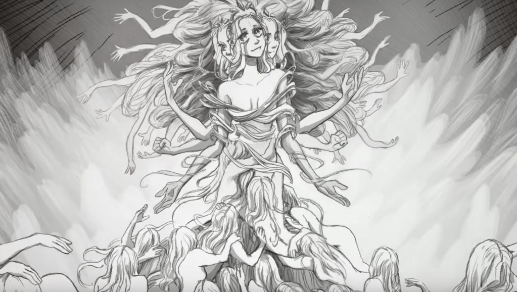 You later find out by finding the mess of hands that it calls itself the shifting mound, a being which uses the princess to speak to you in the place she calls “the long quiet”, the swirling abyss that your stuck in. She needs more princesses to grow her understanding of the world, describing itself as “flickering lights in an empty city”, something that isnt whole. It sees itself as the princess, but more than any one singular princess.