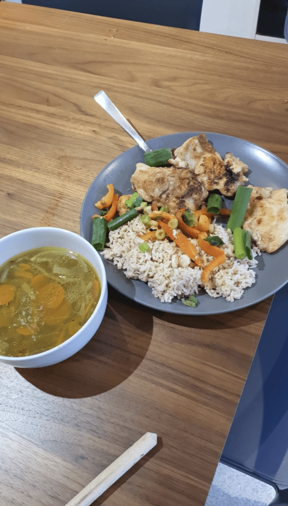 Vegetable soup with rice, chicken and veg :).